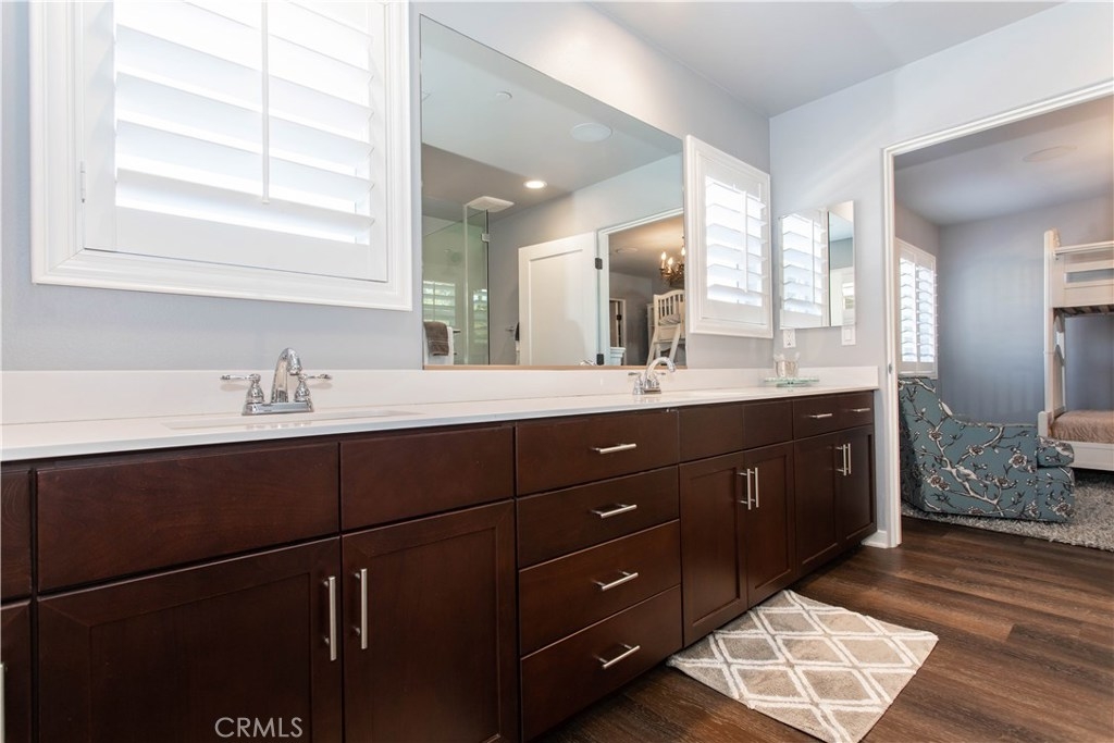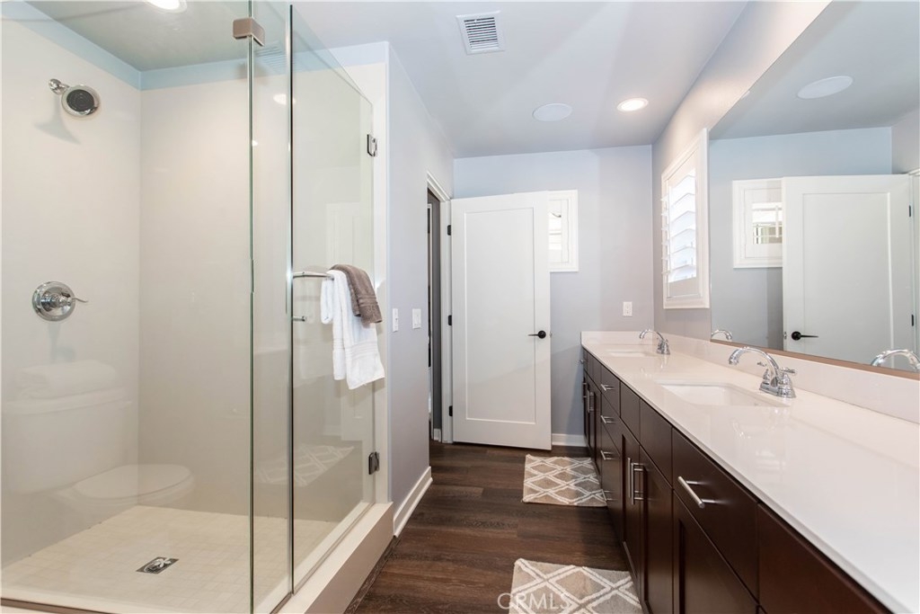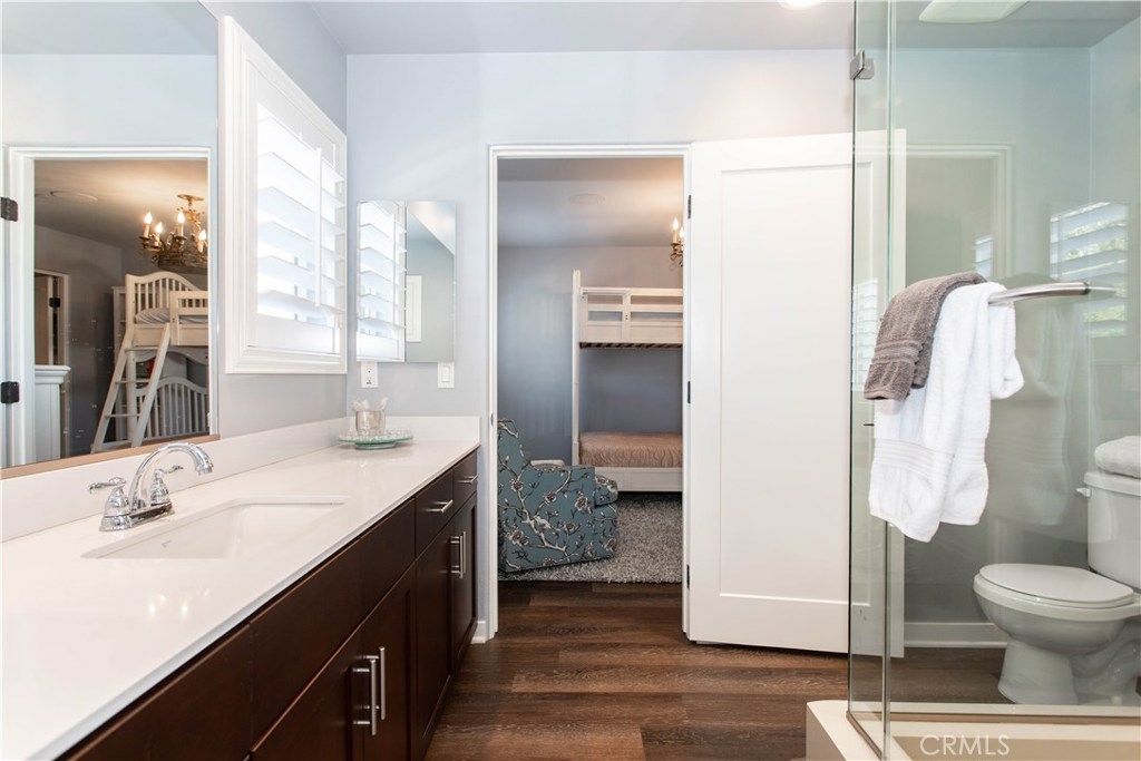 A MUST SEE. Over $80K in upgrades. MAIN FLOOR MASTER SUITE and completely turnkey. Located in the highly desirable gated community of Bear Creek this beautiful home offers 2,188 sq.ft. of living space, 3 bedrooms, LOFT, 2.5 bathrooms, laundry room, 2 car garage and all within walking distance to the pool, exercise rooms, tennis and bocce ball courts. The moment you walk through the front door you are embraced by the open floor plan. The large cultured stone fireplace and vaulted ceilings give the great room magnificent dimensions. The expertly planned kitchen, with special composite countertops, self-closing drawers, plenty of counter space and ample equipment for entertaining, even includes a Summit wine refrigerator. The dining area is spacious. The Main floor Master Suite with large walk-in closet, master bath with oversized shower and dual sinks. Upstairs, a sizable loft and the secondary bedrooms are spacious with a Jack and Jill bathroom and bedroom deck. The indoor laundry room has plenty of storage. The well-sized 2 car Garage offers epoxy floors. Additional features include surround sound, Isocore Tech plank flooring, plantation shutters, Hunter Douglas Silhouette window shades, custom draperies and designer paint colors. Community Amenities include 24/7 security patrol, clubhouse, community center, Olympic-sized swimming pool, spa, weight rooms, cardio room, clay and hard tennis courts, Bocce ball courts, a prestigious Jack Nicklaus designed golf course and more.